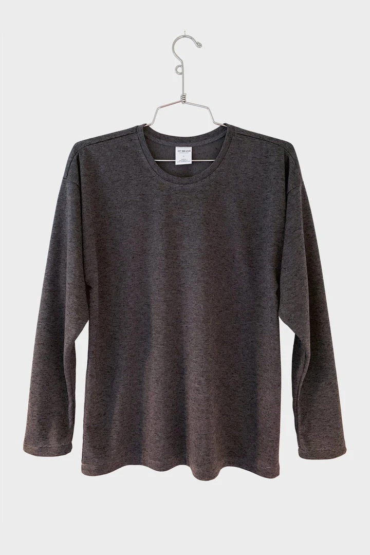 A relaxed fit, heathered charcoal crew neck long sleeve tee with slouchy shoulders and dropped armholes. Wear it in or wear it out, this will be your new go-to essential. Soft, comfy and breathable. Made with low-impact dyes that are better for you and the environment.