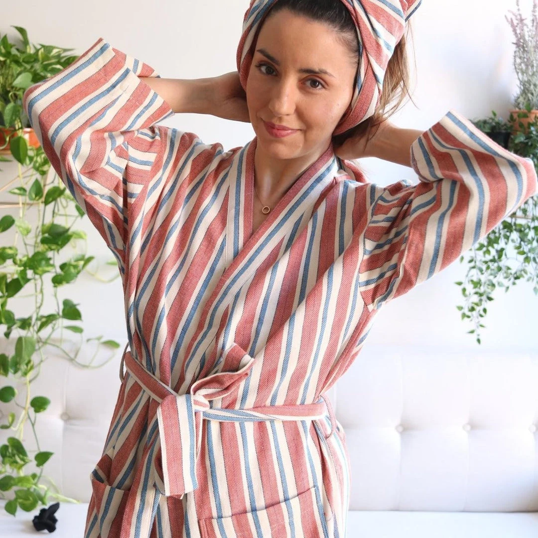 The Terra short Turkish robe is lightweight, absorbent, and quick drying, making it ideal for stepping out of the shower or relaxing on the beach. Made by hand using authentic traditional techniques. Turkish towels (or peshtemals) have been used for centuries in hammams, the traditional Turkish baths, where bathing is a slow, relaxing ritual rather than a quick, daily need.