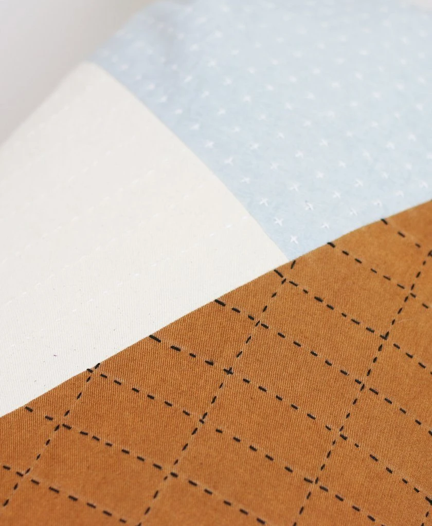 Naari lumbar pillow features vibrant geometric patchwork with contemporary embroidered accents. Colorblocks of contrasting patterns make it a vibrant addition to any space. Add a touch of visual luxury to your home decor with this hand-stitched organic cotton pillow, a beautiful companion to your Naari quilted bedspread and throw pillow.