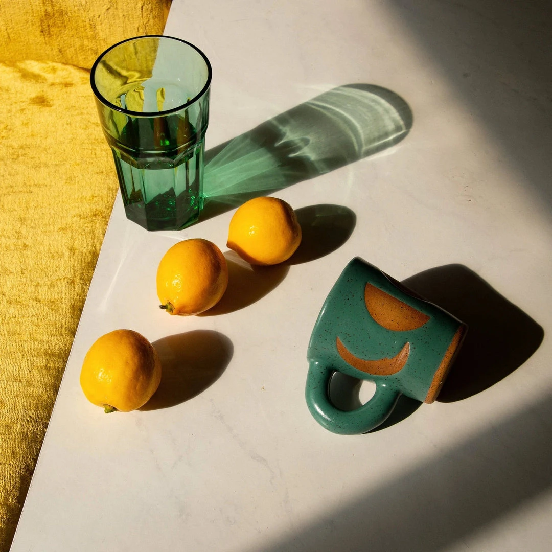 Features a 360 degree lunar phase pattern. Available in buff clay with a matte white or spruce green glaze.