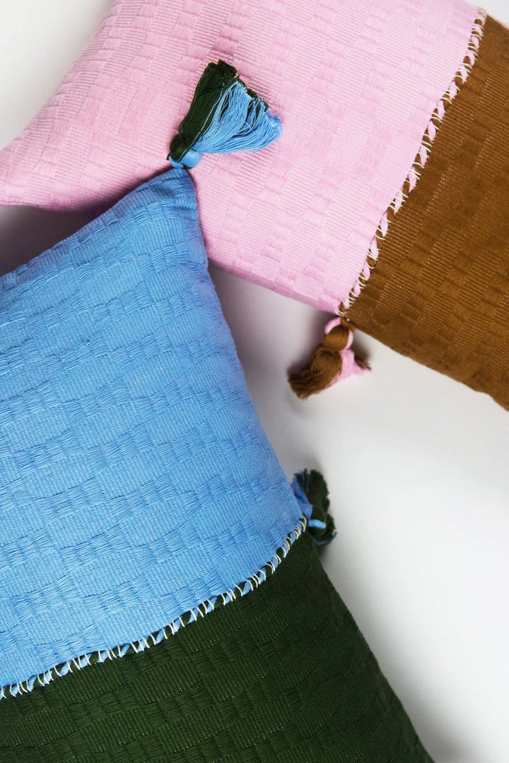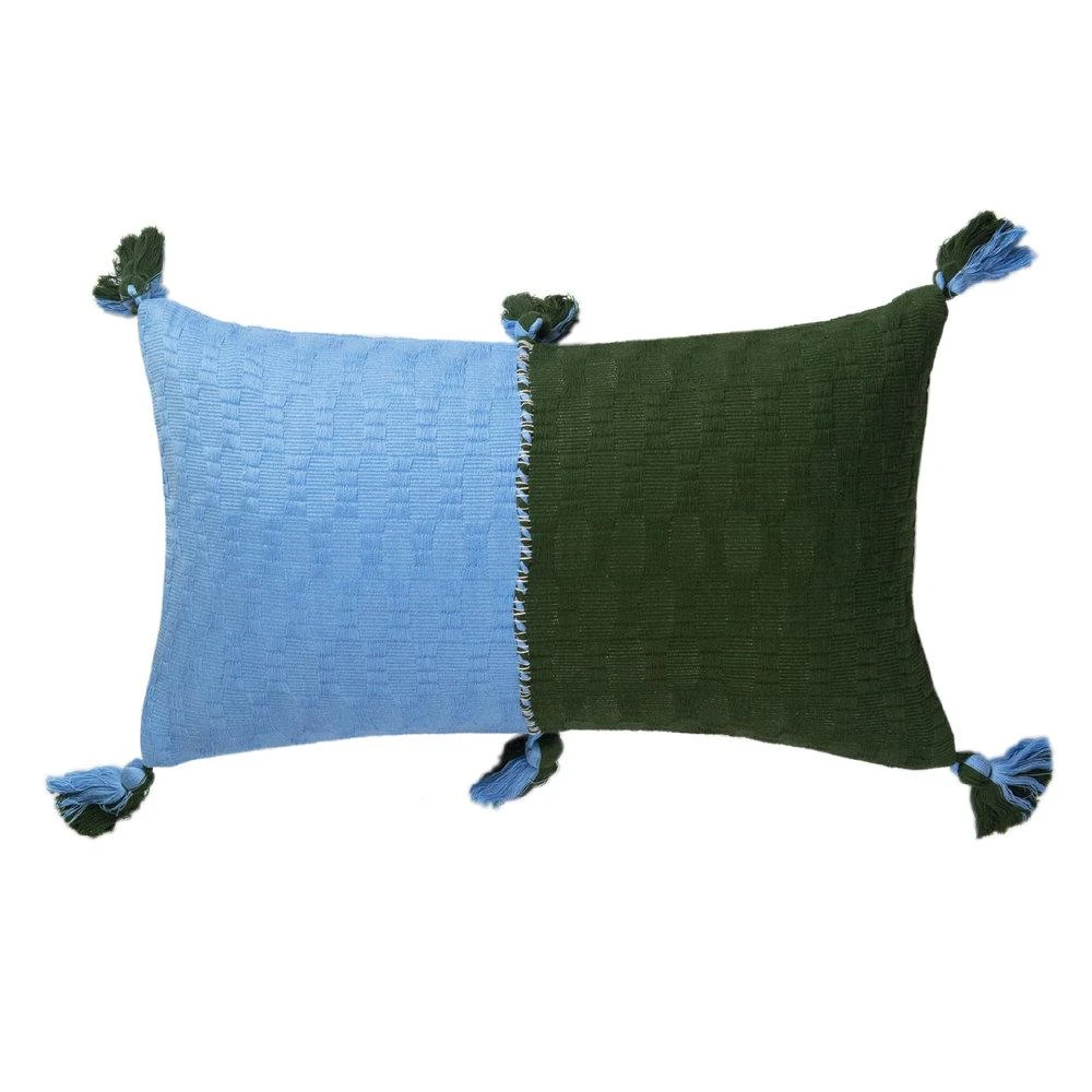 This olive and blue pillow is inspired by traditional textiles from Almolonga, Guatemala. The cotton used to make this pillow was handwoven by artisans using a back-strap loom.