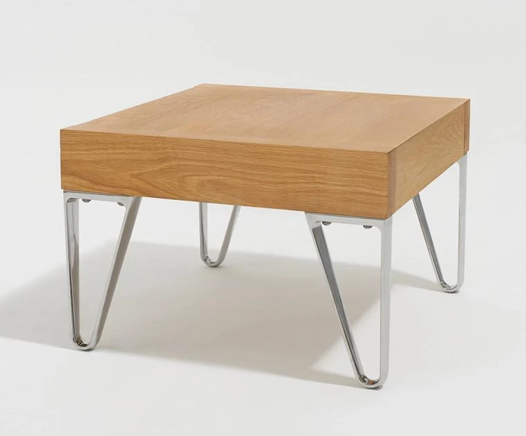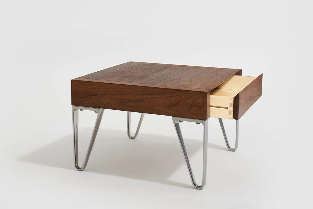 Nightstand with a wood top and discreet drawer in solid American white oak or walnut with an oil finish. Die-cast aluminum legs. Designed by Magnus Lundstrom. Made in America.