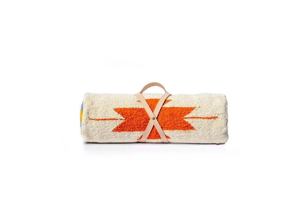 The Horizonte Collection symbolizes the intersection of the sky and the earth. Your new blanket comes rolled up with a handmade leather strap, making it ready for any adventure. This blanket is big enough for a 2-4 person picnic. These vibrant, modern blankets are handwoven in Mexico using upcycled yarn from the garment industry.