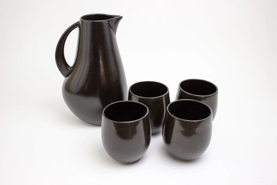 Drinkware should be simple and easy. Sleek enough for a fancy dinner party, and earthy enough for an improptu happy hour. The stoneware pitcher insulates your refreshment. All cups are weighted towards the bottom for the most comfortable grip. Beautiful and easy to use. All glazes are not identical and variation is expected as a result of the process in the kiln.