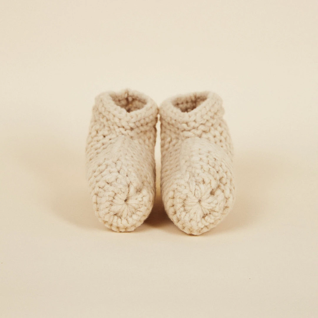 Slippers 100% hand made fair by artisan women in Patagonia using only natural sheep’s wool. With use, they will conform to the shape of the wearer’s own foot. Includes QR code with artisan info and geo-location and a repair kit to personalize or repair as needed.