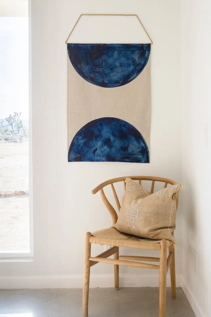 The Mono minimalist wall hangings are hand-painted in Los Angeles using indigo artist’s acrylics and graphite on natural linen. The raw, solid brass hardware was machined in Los Angeles as well. Each piece is made just for you, making them one of a kind.