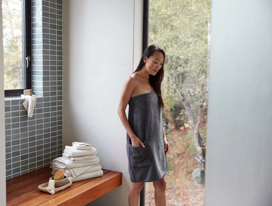 The comfort and performance of the Air Weight towel, designed to enrich your post-shower ritual for the full spa experience at home. Loomed from long loops of pure organic cotton in a twill weave, whose highs and lows create the perfect texture for drying off quickly and efficiently. Sculpted into a relaxing wrap with flexible elastic around the back and adjustable buttons above the bustline. Smooth percale binding around the edges.