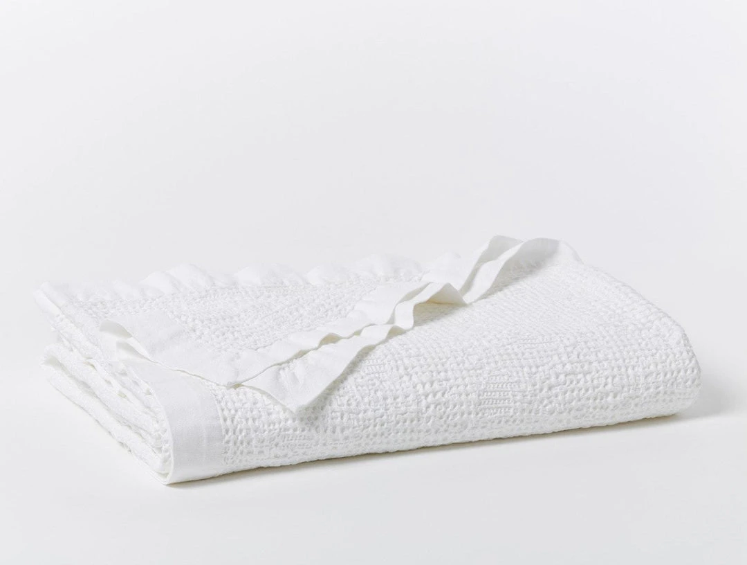 A waffle blanket mixing fine and large waffle patterns with unique variations in texture, which provide warmth without weight. Named for the Point Reyes shore, whose rock patterns’ randomness inspired the multi-waffle weave. Product dyed and washed for softness. Trimmed with a wide, flat weight canvas hem.