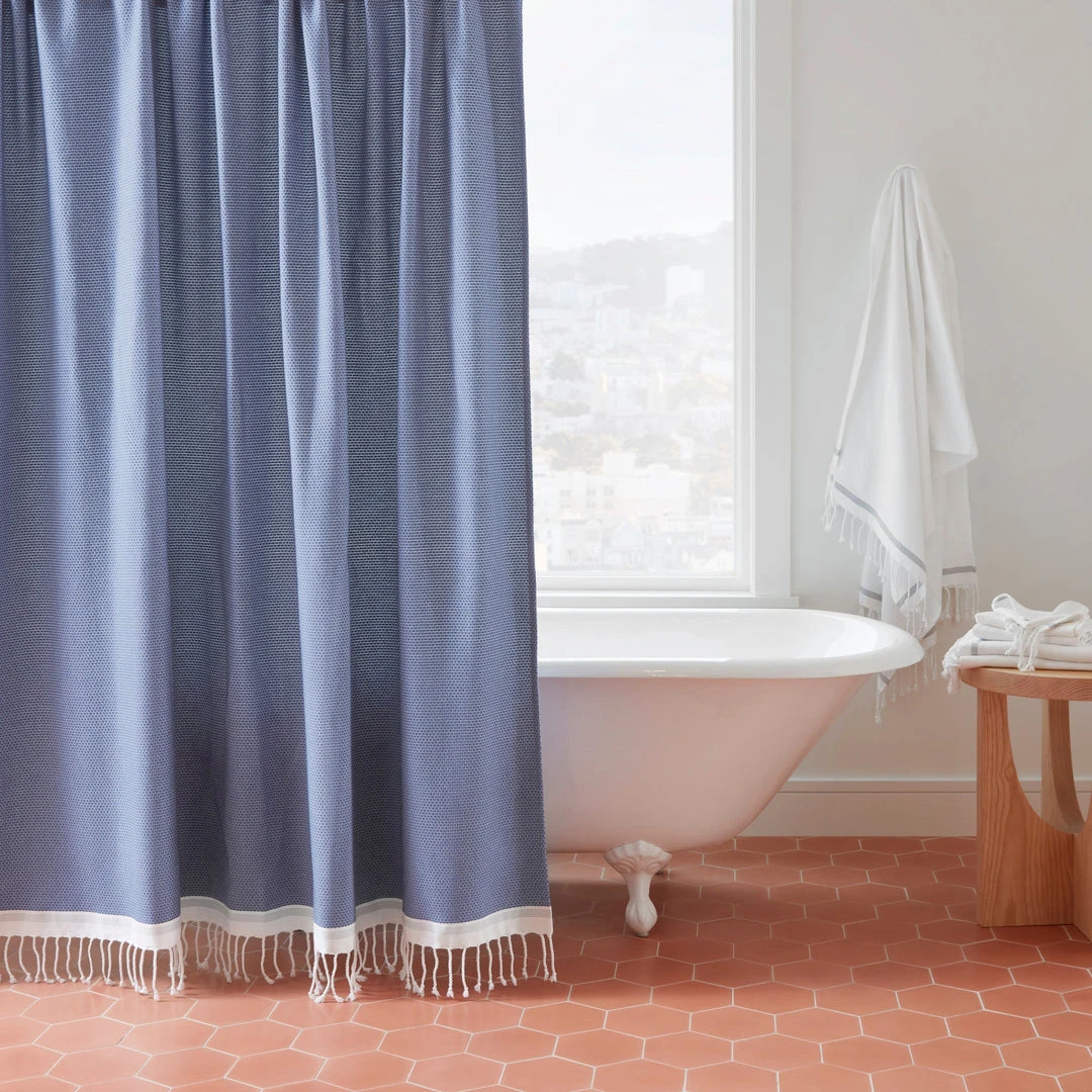 The Mediterranean Shower Curtain takes the Turkish flat weave of a Turkish towel to make a generously sized shower curtain to complete your spa oasis at home. Made with lightweight, high/low weave, this yarn dyed organic cotton curtain is absorbent, quick-drying, and finished with a GOTS-certified process that prevents shrinkage.