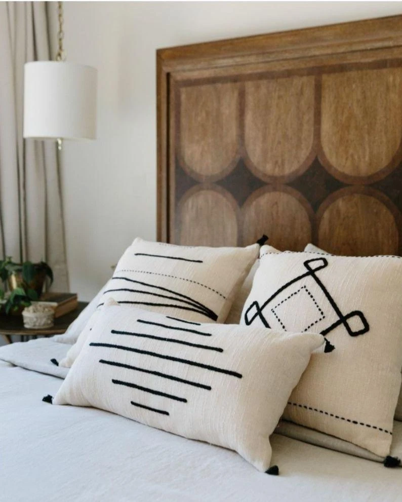 The Ariana Throw Pillow draws inspiration from Tunisia’s rich Berber heritage. Hand-woven cotton is embroidered with striking designs in black wool and finished with petite tassels.