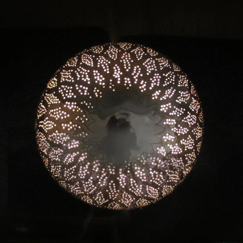 This modern Moroccan pendant light is a harmonious marriage between traditional craftsmanship and modern design. The negative space directs all focus to the elaborate design seen at the top of this exquisite pendant lamp. Nur casts brilliant shadows onto the ceiling, while creating a focused light at the base, making a perfect addition to dining and living spaces.