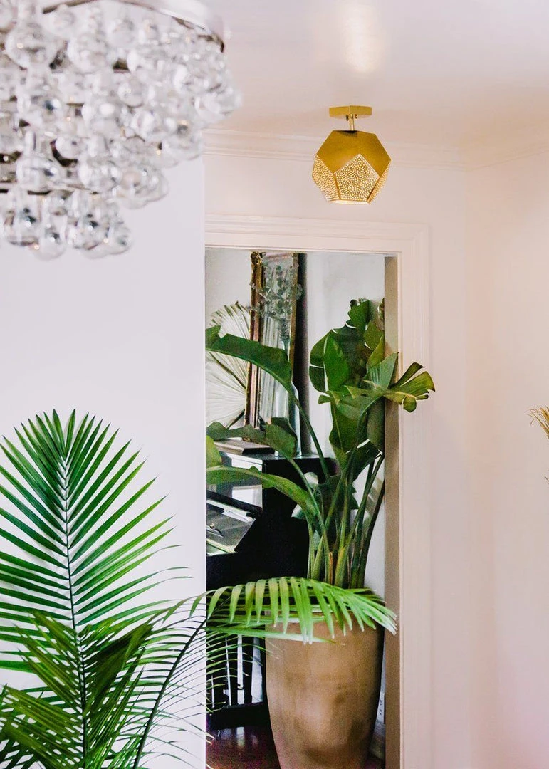 The Ula Semi-flush Mount Light offers an intriguing, geometric design featuring a metal pentagonal shade. This bold and angular light fixture combines geometry and intricate Moroccan craftsmanship. Designed in the USA and handcrafted in Morocco. The hand pierced shade casts a pattern of regal tranquility, directing movement of energy throughout the space.