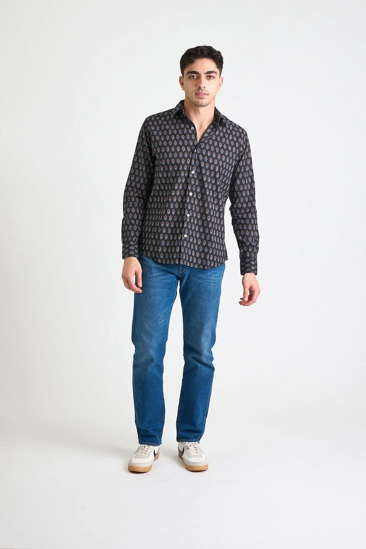 The Amir Shirt is a modern take on a classic long sleeve button down, featuring a red and blue motif over black fabric. Made in small batches with hand screen printed techniques, which results in natural inconsistencies giving this shirt an elevated, handcrafted look. Please note that the actual color may differ from the pictures due to computer lighting and hand-made nature of the fabric.