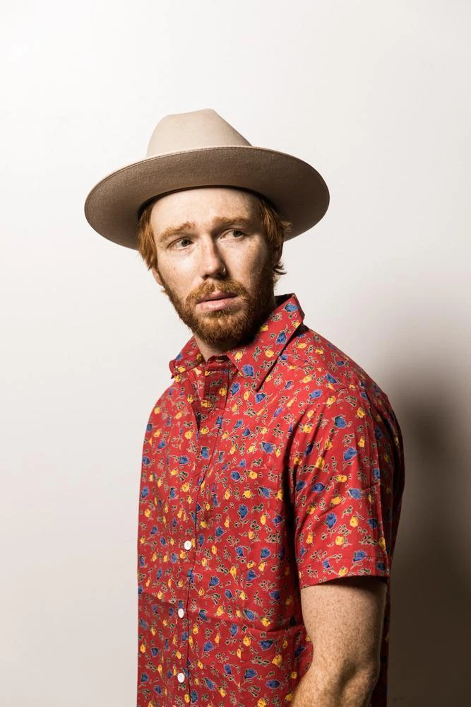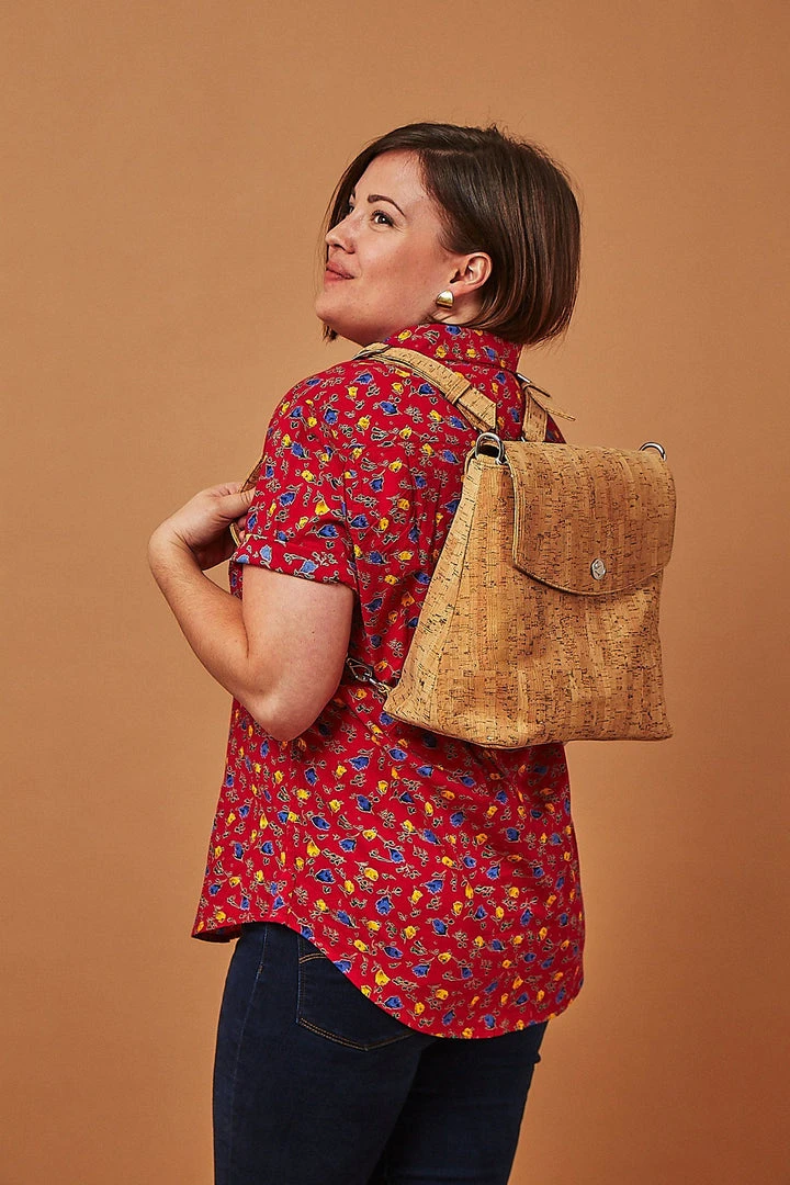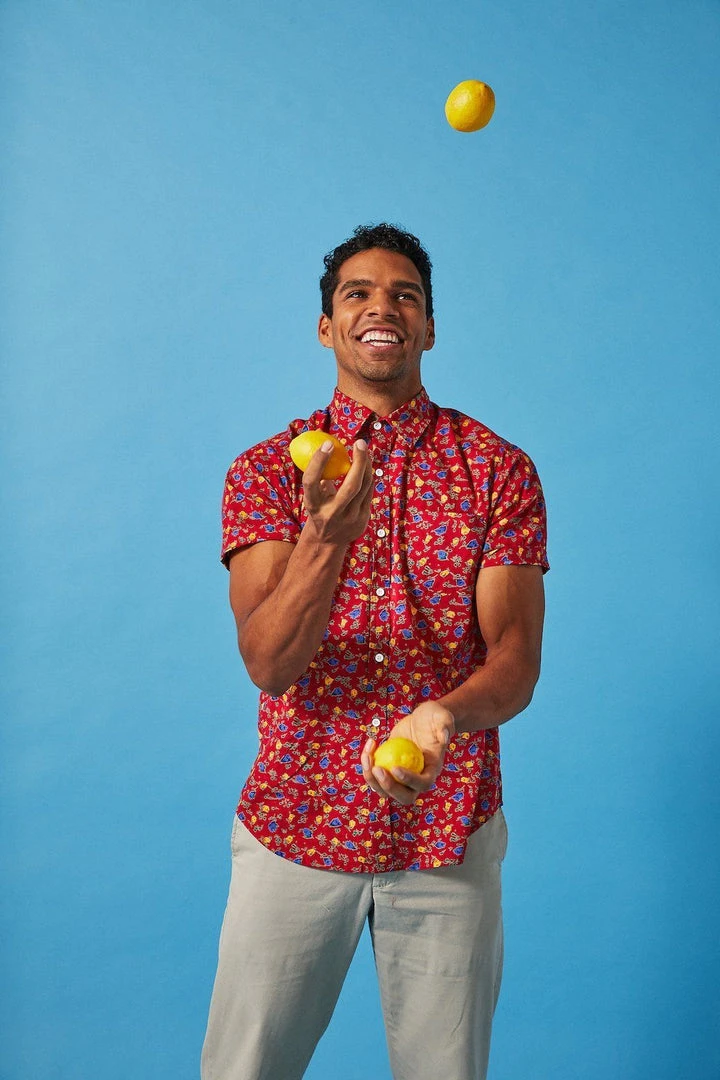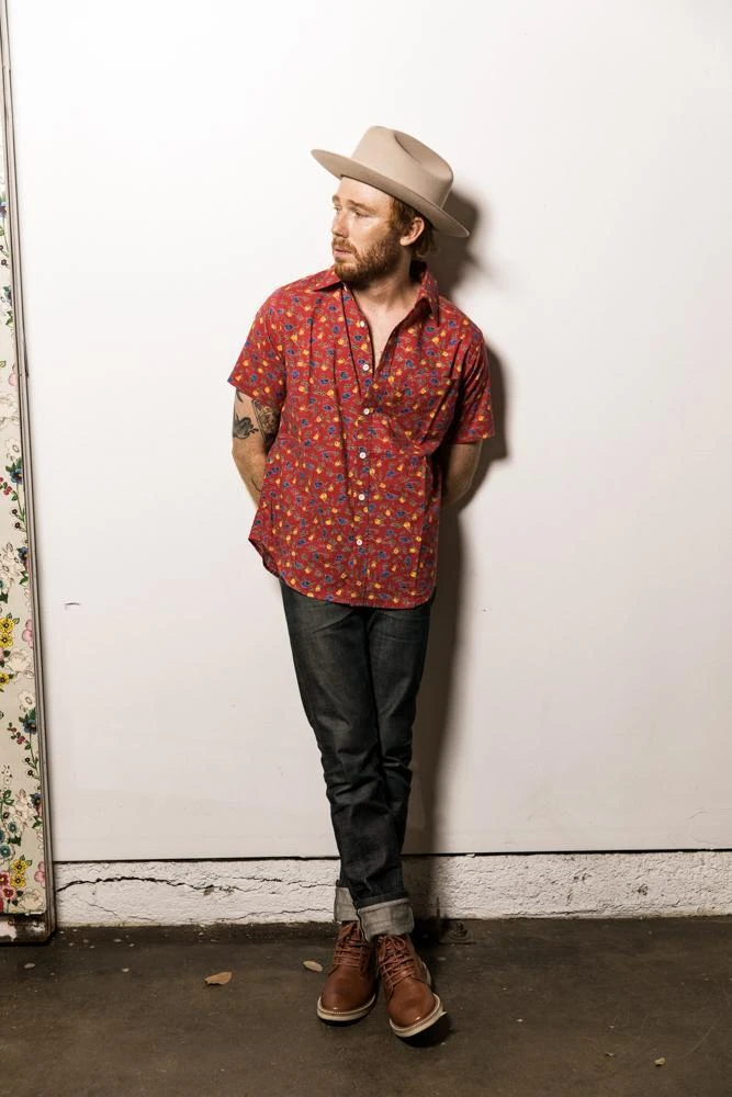 A short sleeve men’s button down shirt with a hand printed floral motif on a maroon background. The perfect addition to men’s sustainable wardrobes, this short sleeve button down can be dressed up or worn casually with its slim fit. Designed in Los Angeles and hand block printed in a fair trade environment in India.