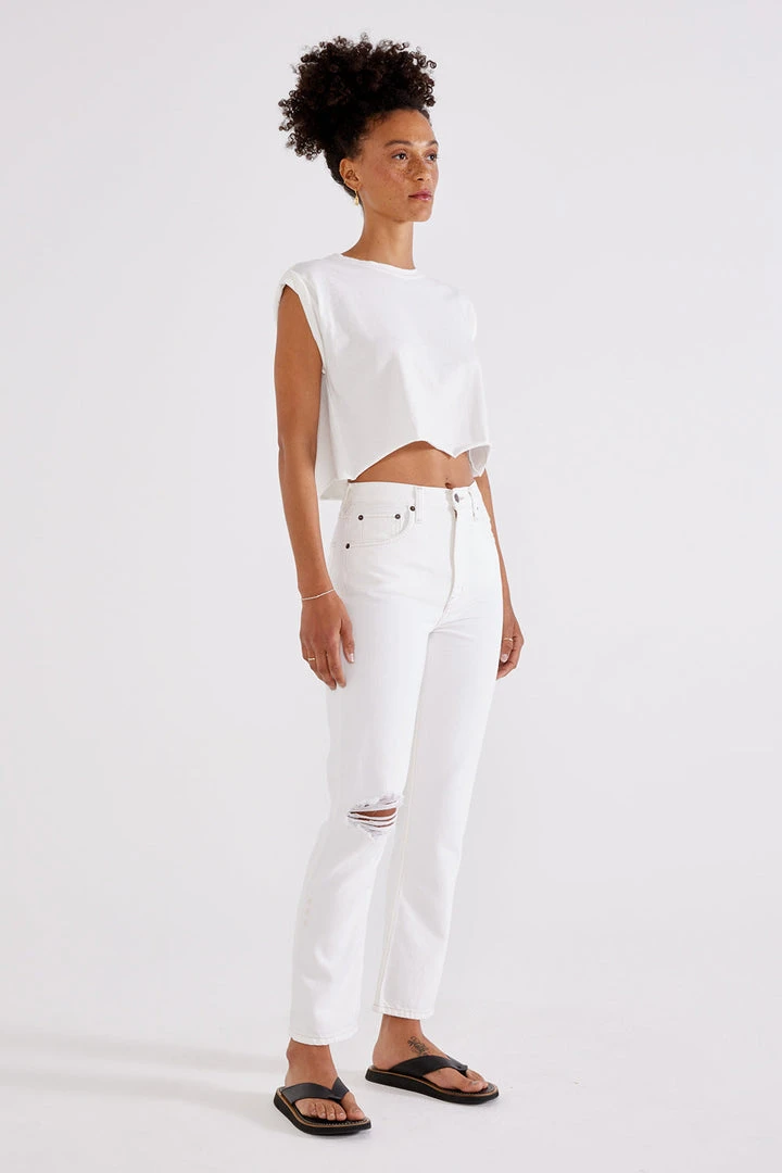 A slim straight leg jean with a high rise and vintage construction. A singular statement knee rip adds a pop of skin to a soft white wash.
