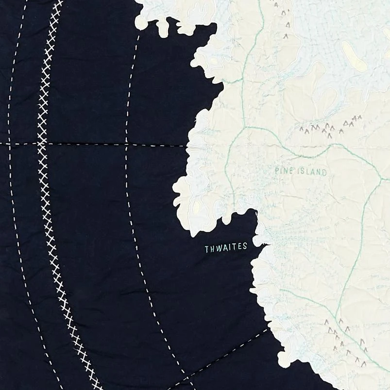 The Antarctica quilt features a view from the South pole projection and illustrates the movement and velocity of the ancient, miles-thick ice as it speeds through the polar continent’s glaciers. Appliquéd white cotton is layered on top of black cotton, with additional pale blue cotton appliquéd to show sea ice movement, calling attention to the dramatic changes brought about by climate change. Includes Scott’s 1911 route to reach the South Pole from Ross Island.