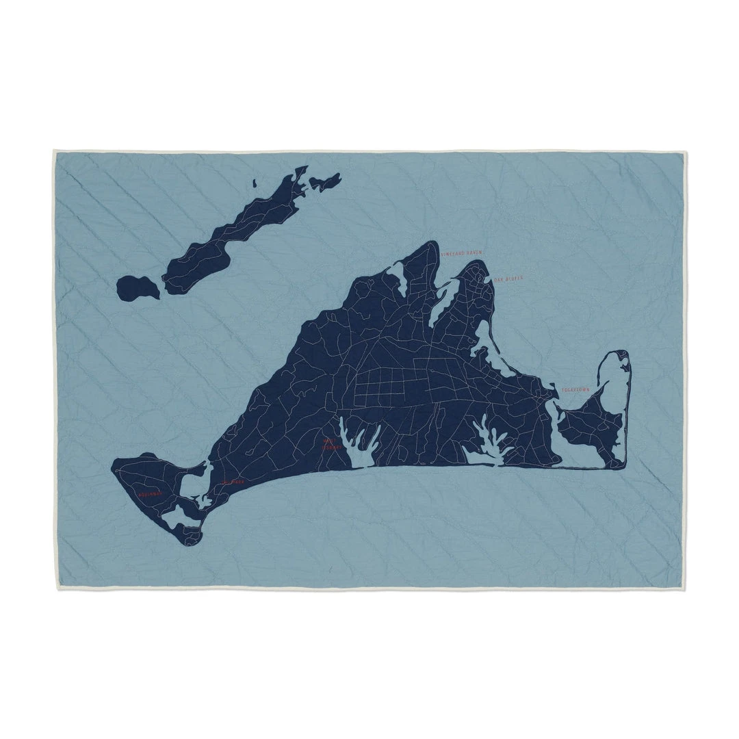 The Martha’s Vineyard organic cotton quilt features a quilted map of the popular Summer getaway destination with the embroidered names of Edgartown, Oak Bluffs, Vineyard Haven, and Aquinnah. Style it on your couch, favorite reading chair, or on the wall as a tapestry.