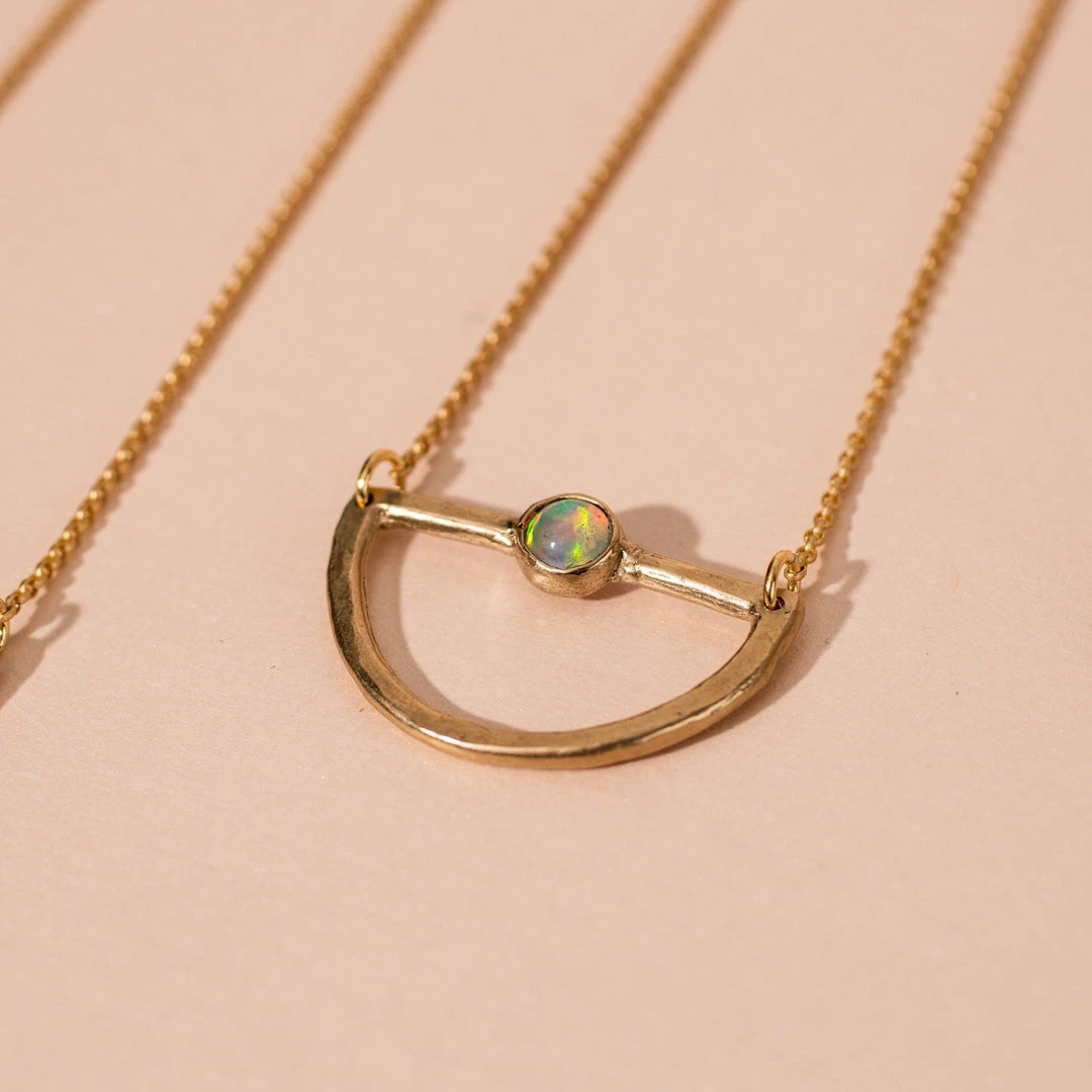 A single brass half circle reminiscent of the waxing moon is dotted with a stone of your choice in the center. A beautifully minimal addition to your jewelry collection. Learn more about lab-grown gemstones on Made Trade Magazine.