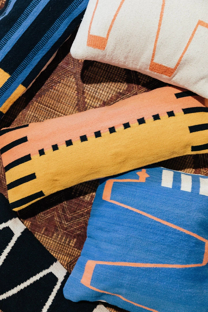 The Ladders lumbar pillow is made of wool that has been spun, woven, and dyed by hand. Each pillow is crafted by an artisan collective in Oaxaca, Mexico. The yarn is hand dyed with naturally derived dyes cultivated by the artisans. Due to the handcrafted nature, slight color variation may occur.
