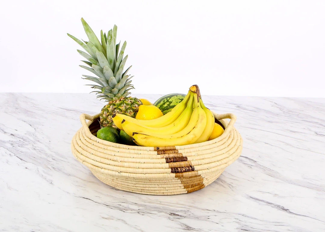 Use the Banana Striped Basket as a centerpiece for any tabletop or as an eye-catching fruit basket. This shallow bowl with handles is great for storing animal toys, hobbies supplies or to roll up blankets to sit next to a couch.