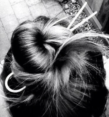 This brass hairpin is a simple and stylish way to keep your hair back. No snags or getting a ponytail holder tangled in your hair. Simply pull the tongs apart and insert them into your hair. Perfect for messy or neat buns, top buns, or French twists.
