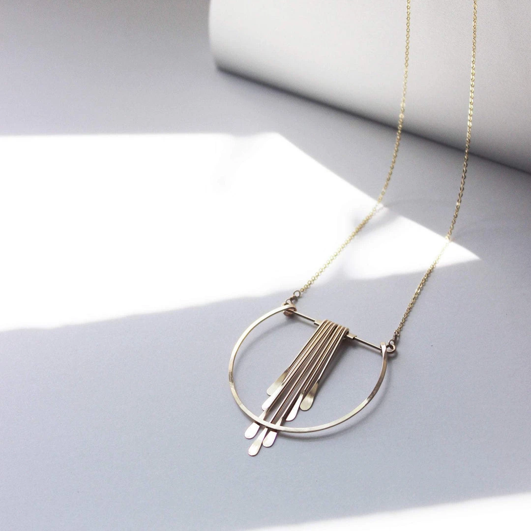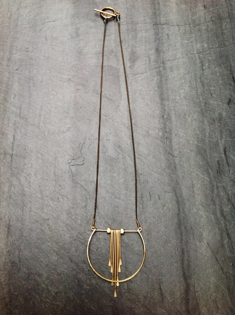 This geometric statement necklace is modern and unique. Easily dressed up for a night out or worn with a t-shirt and jeans to add shine to a casual look.