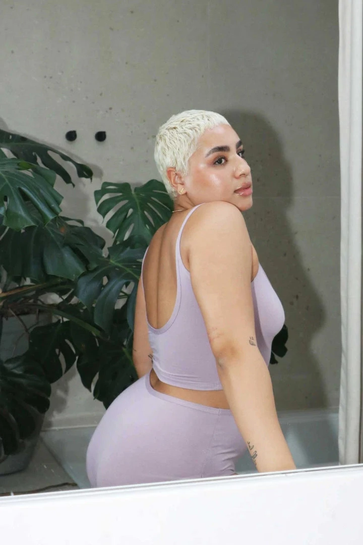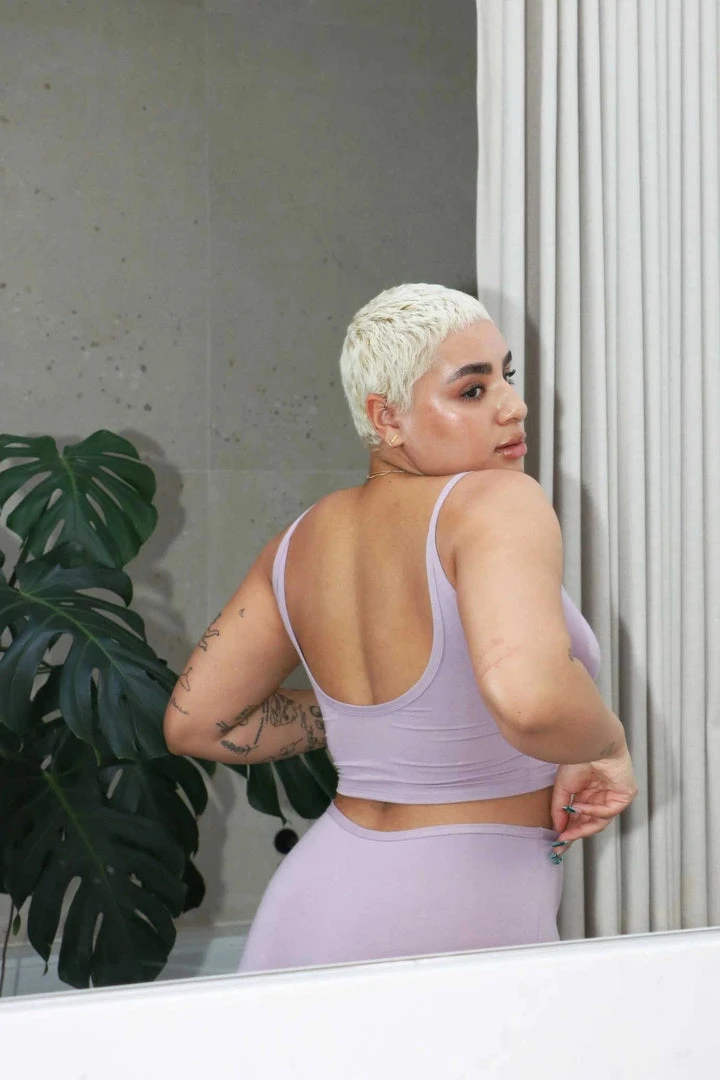 Jonelle (Lavender) is 5’4″, a 36B and wears a Large.