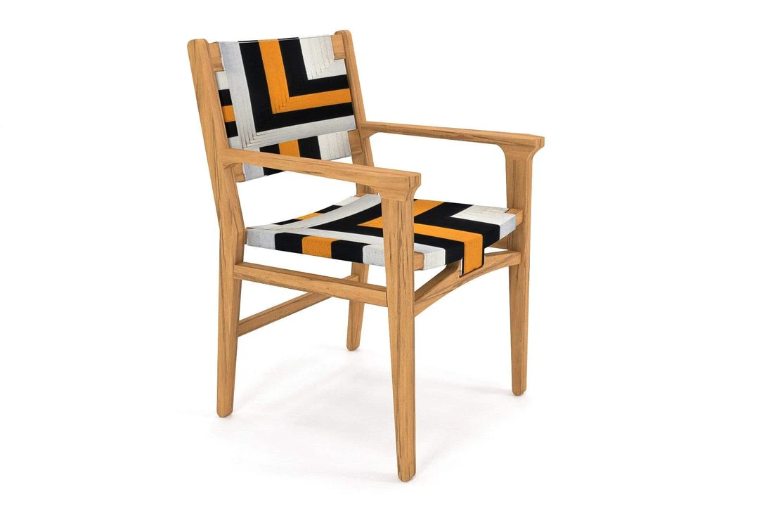 Modern yet timeless, the Chontales Arm Chair in the Queen Bee pattern is handcrafted by artisans in Nicaragua from sustainably sourced wood. Featuring a handmade, solid wood frame with armrests and a handwoven seat and backrest, the Queen Bee’s bold, black, yellow, and white geometric design will create a buzz in any of your living spaces.