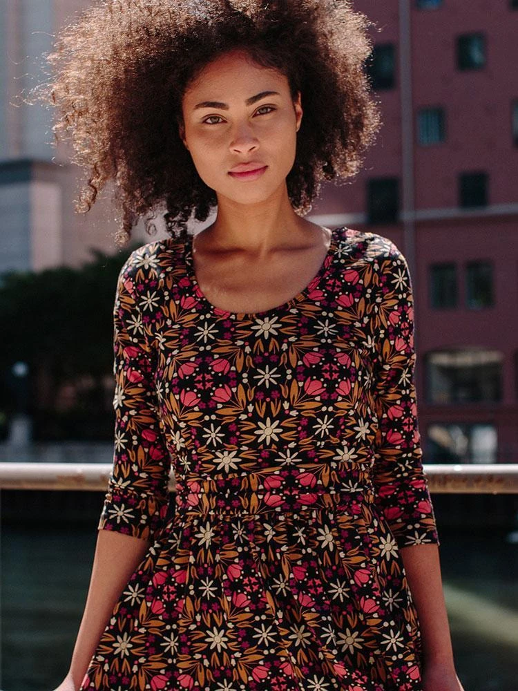 The retro floral print on this 3/4 sleeve organic cotton jersey dress says it all.