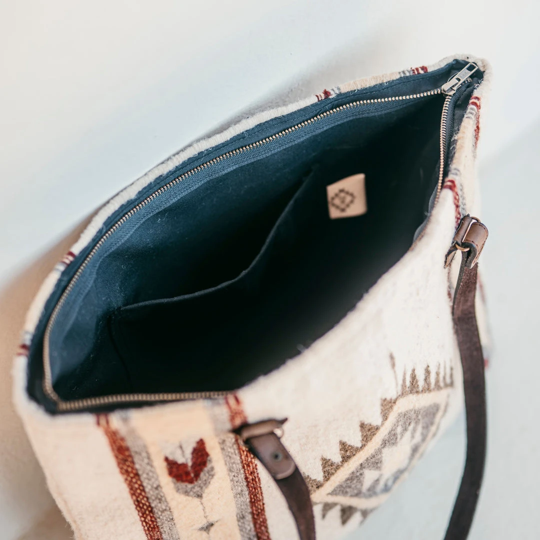 The Snowflake pattern features a Zapotec diamond and arrow design in cranberry red, soft gold, and green on natural cream wool.