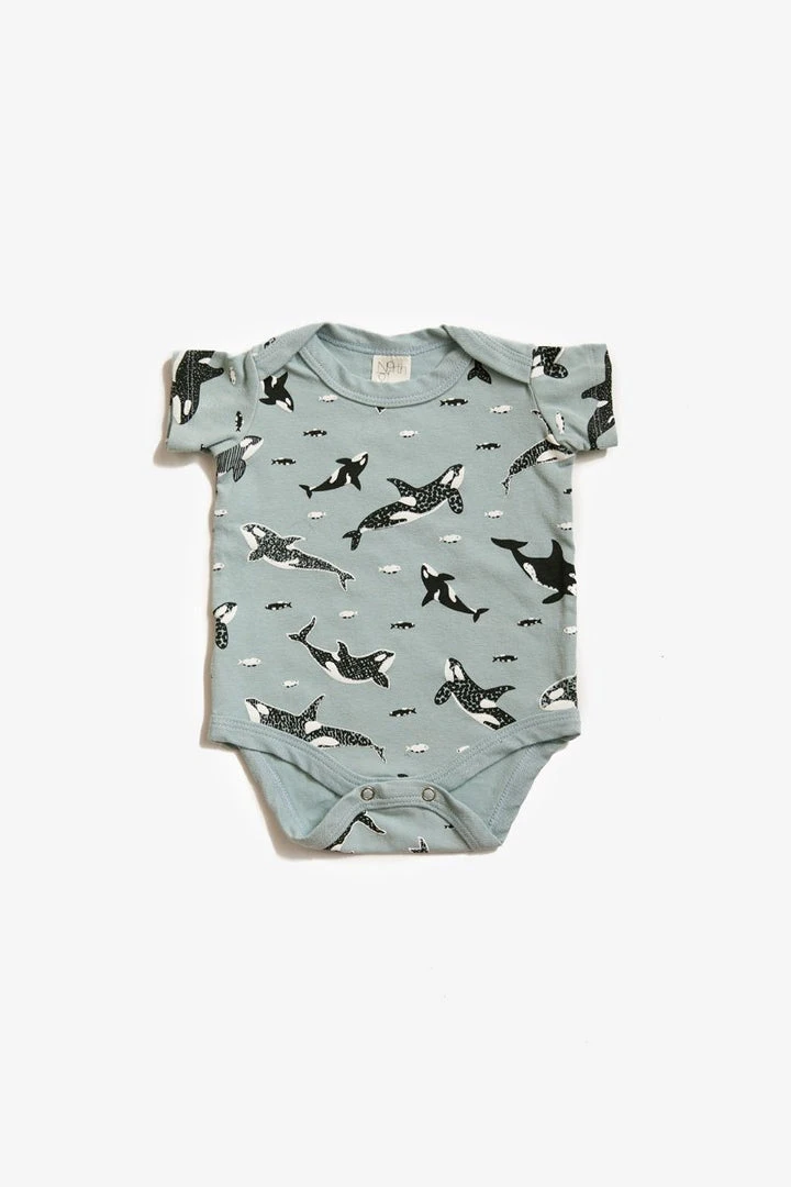 Super soft organic short sleeve onesie, all over printed in North of West’s Orcas print. Envelope neckline and a two snap closure for easy baby changing.