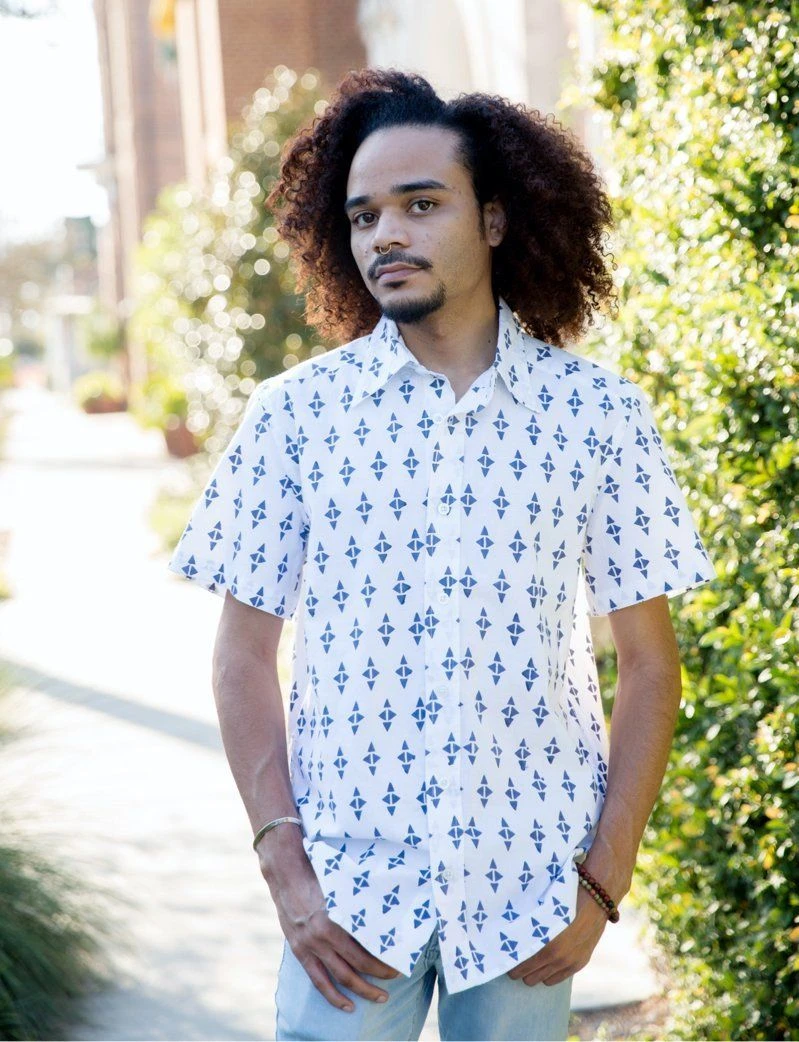 This short sleeve button down features a hand block printed blue diamond print. Gentle tapering at the waist with a straight and narrow profile and a broader fit in the shoulders gives this shirt the perfect fit. Wear it to work, at dinner dates or to the park with friends.