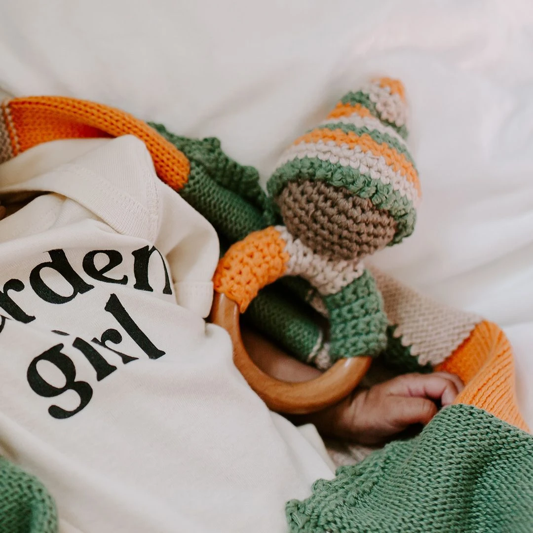 These sweet little pixies are here to help your baby through the teething process. They are hand knit using organic cotton to ensure your baby’s safety, and they include a rattle top to both sooth and aid in motor and cognitive skills. Available in several colors, the Pixie Rattle and Teething Ring is sure to put a smile on your little one’s face.
