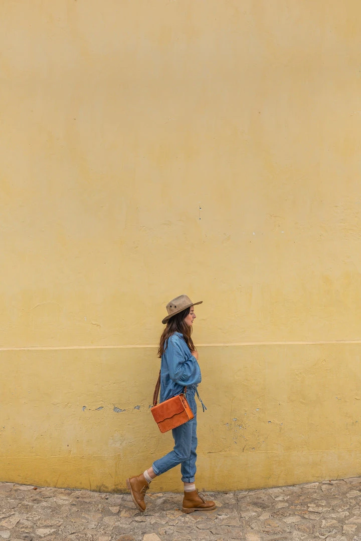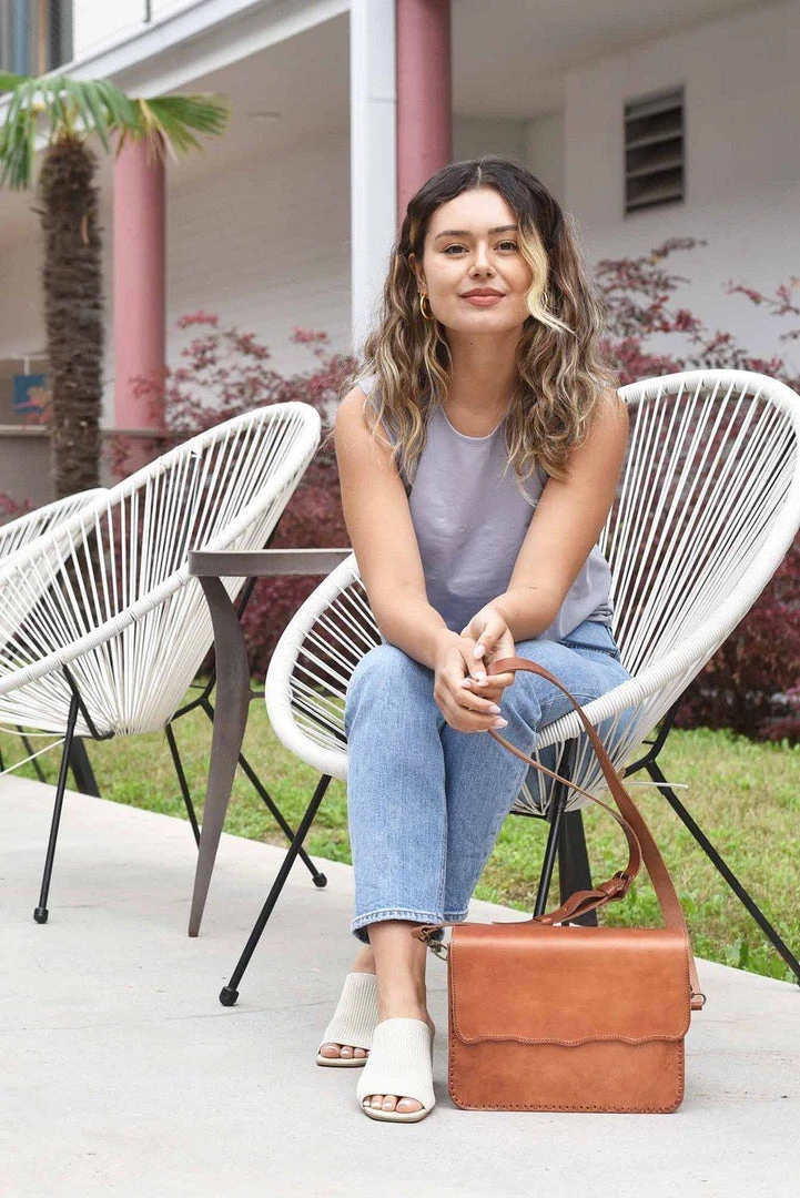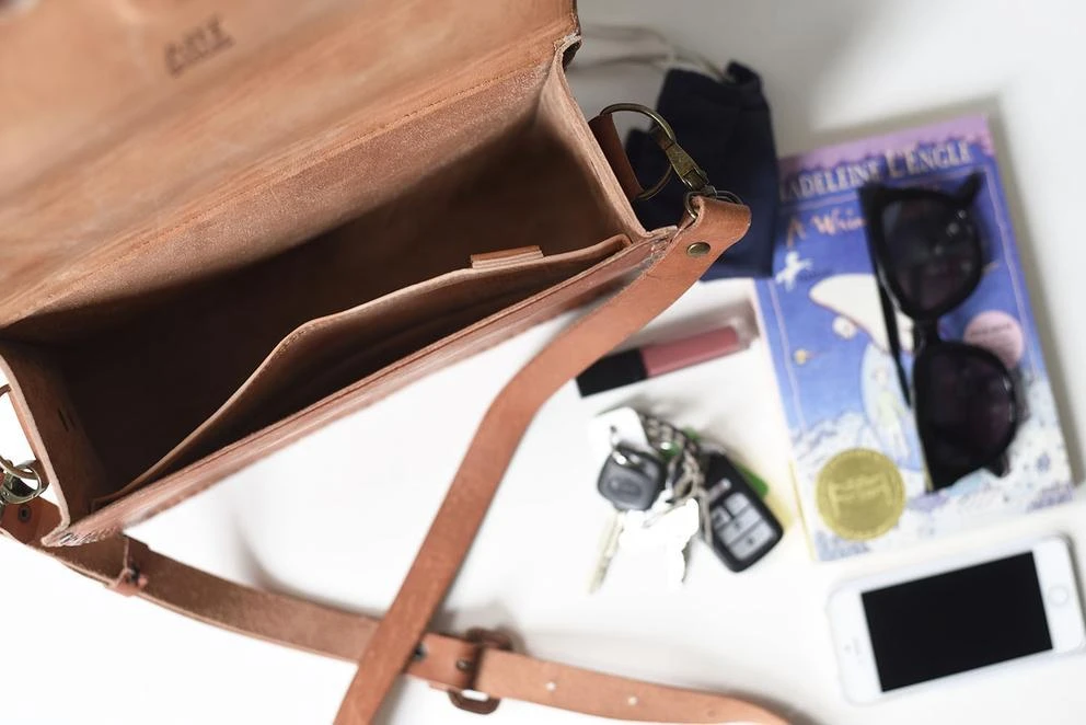 This classic and chic crossbody bag features a raw edge fold over magnetic closure, interior leather pocket, and d-ring clip for keys.