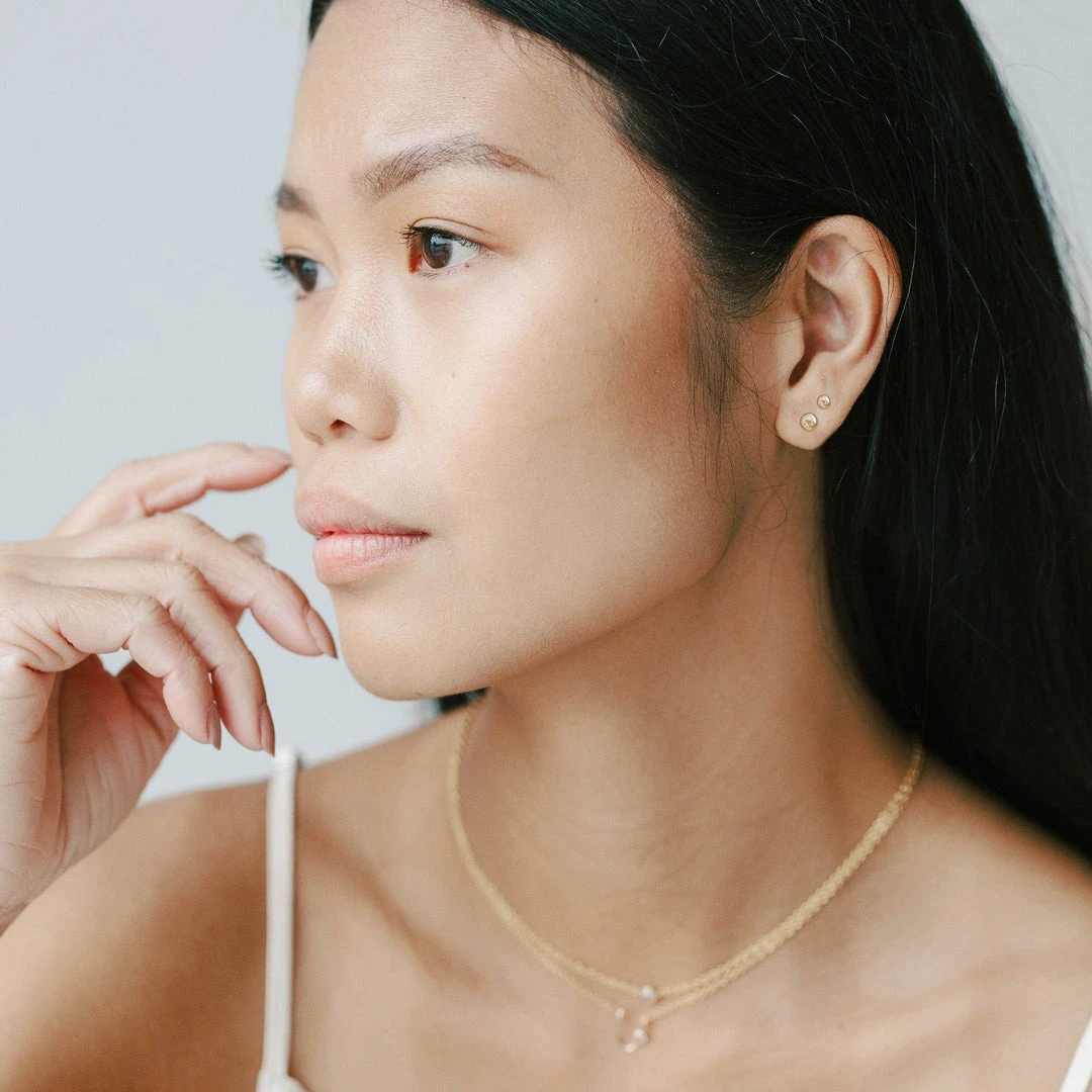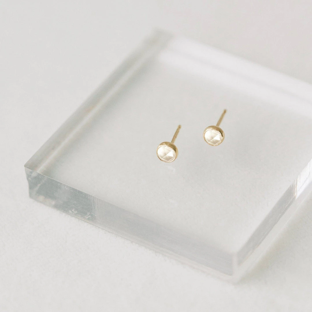 These golden white topaz studs are light and dainty. Wear them on their own or pair with the Deep Pearl Recycled Gold Studs.