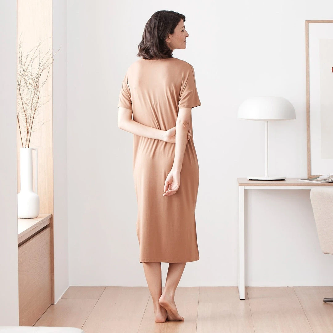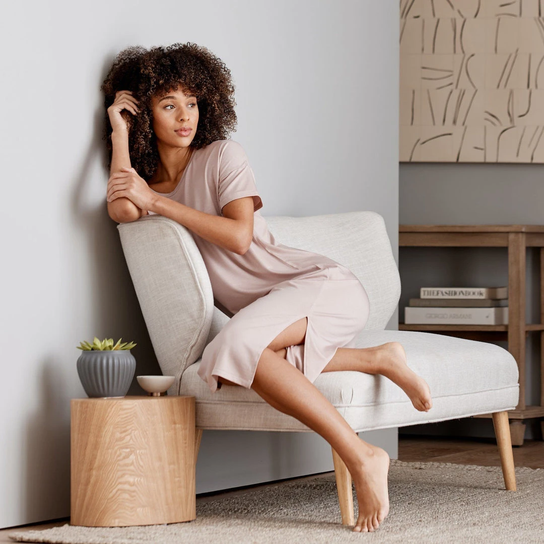 The Midi T-Shirt Dress features a chic, fitted silhouette with an on-trend midi length, making it an ideal piece to wear around the house, or to even run an errand or two. And with super soft Eucalyptus material, you’re going to want to live in this dress. Layer with a cute jacket or sweater to wear this out and about for coffee or other quick errands.