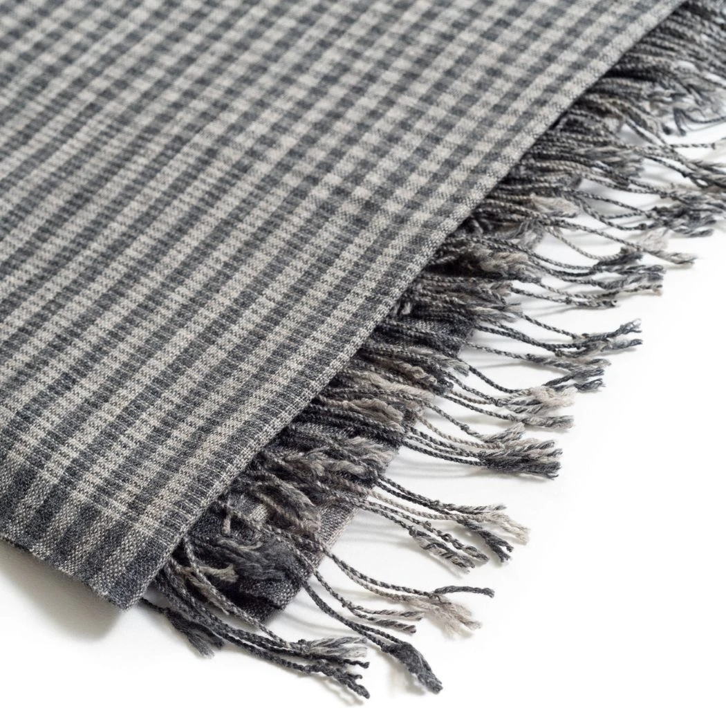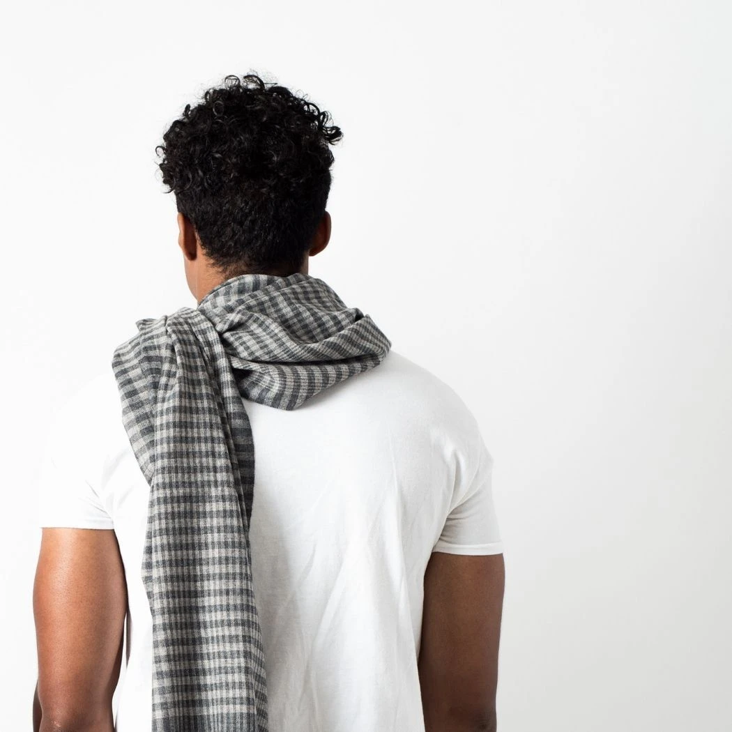 Handwoven on looms in Nepal, Carbon Checks Scarf has been handwoven using a neutral black and white palette. This scarf is also a unisex piece and perfect for gifting or personal purchase. Warm brown and grey checks form a classic palette for this style. Comes in individual cotton envelope shaped pouch made by the same artisans who crafted the scarf. This keeps production inclusive and keeps packaging sustainable.