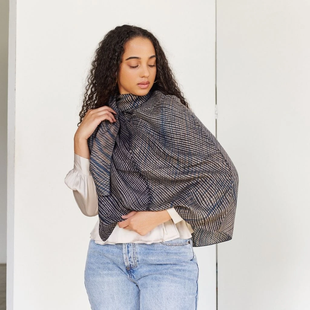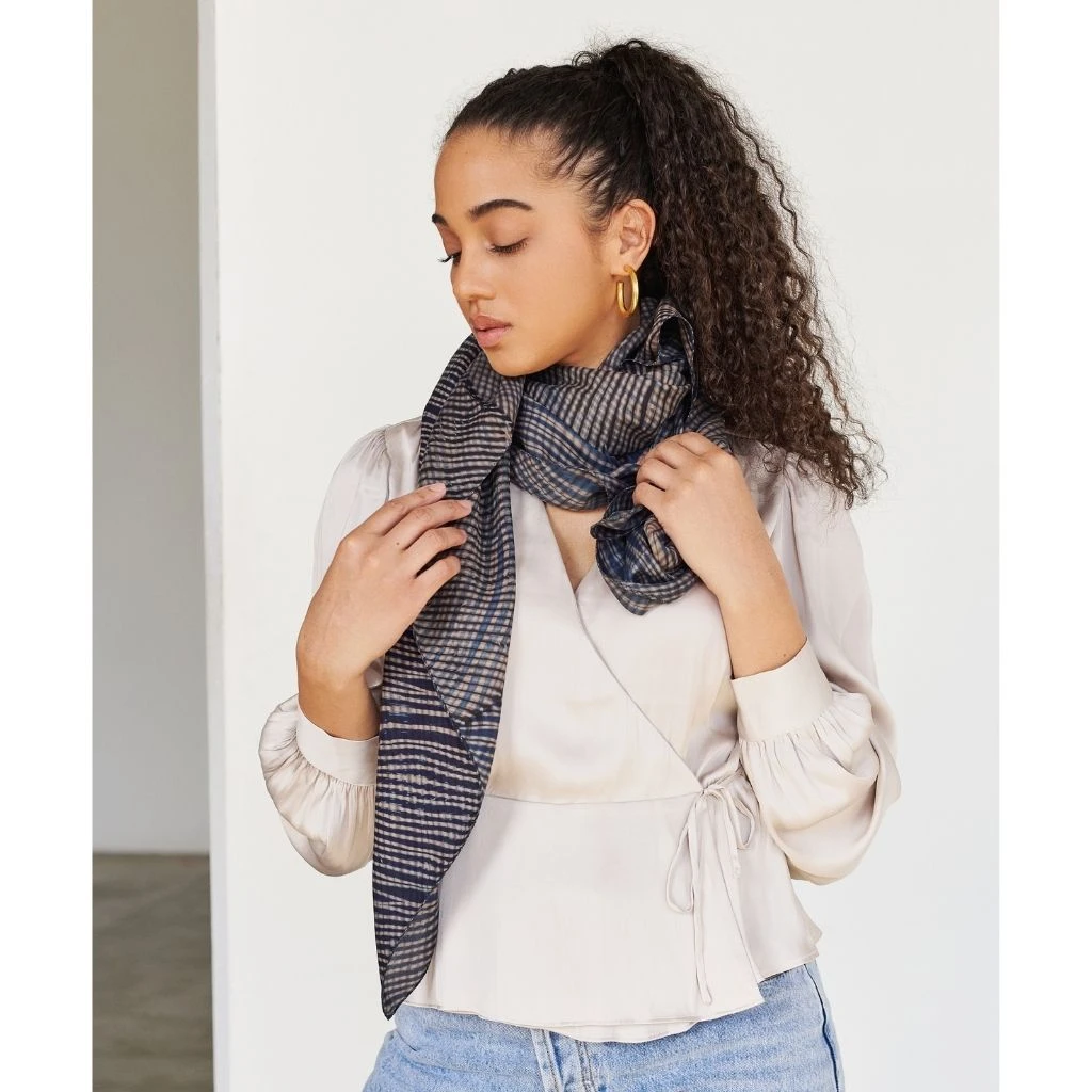 The Layaa Indigo Silk Scarf is an effortless and luxurious everyday accessory. Layaa means harmony of tunes in Hindi, and the timeless style will add an elevated touch any outfit. Wear it as a wrap or around your neck for an extra layer, or style it in your hair or on your handbag for a sophisticated touch. The design is created by tightly winding the fabric and hand dyeing with non-toxic, organic dyes. The base color is created with dyes from Acacia Tree. All scarves are handcrafted in small batches to ensure high quality and less waste.