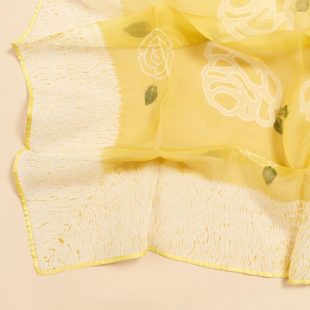 The Primrose Turmeric scarf is a timeless piece that can be worn in a variety of ways. Made by master artisans in India, this scarf has been crafted by using a unique combination of hand painting and shibori technique applied in stages all by the master craftsmen who carefully make this piece in slow stages. The edges are carefully hemmed using silk fabric which secures the borders and gives it a fine luxurious touch. Natural dyes are dried in the sun to conserve energy.