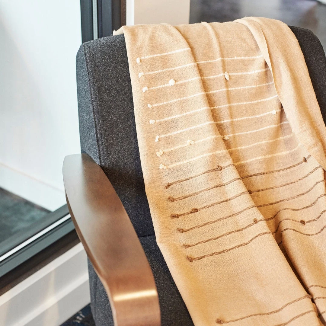 This handwoven throw is dyed with earth friendly dyes and made with hand spun yarn. It is made up of subtle textured stripes that create luxurious neutral gradient effect. The classic design and subtle color will add warmth to any room in your home. Comes packaged in a reusable canvas cotton pouch.