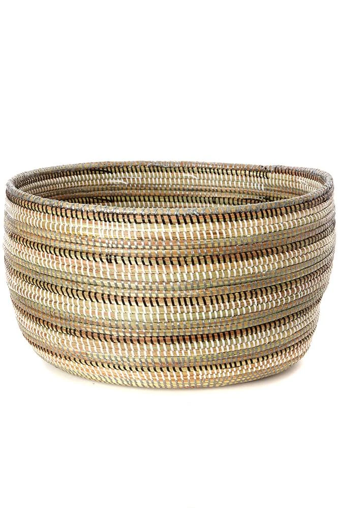 Swahili African Modern’s baskets and hampers are hand-woven by the Wolof women of Senegal who are traditional, artisan basket weavers. Each basket and hamper is made with natural cattails and reeds, accented by colorful strips of plastic from used prayer mats.