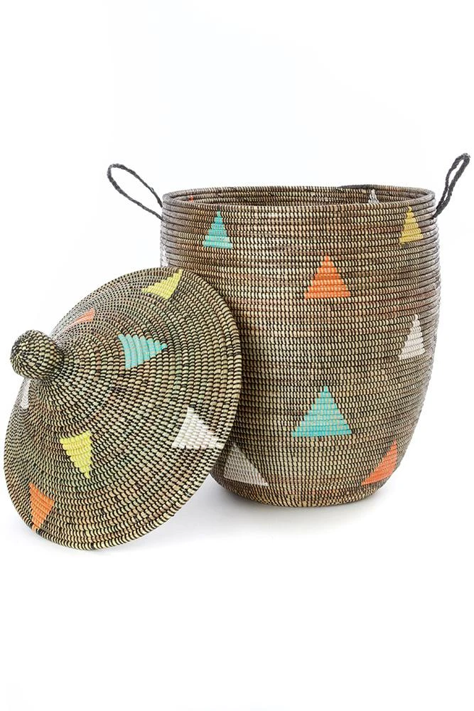 African laundry hampers bring beautiful modern artisan craftsmanship to homes around the world. Handwoven by an association of more than 100 rural Wolof women in the West African nation of Senegal, these useful storage baskets are woven in the coil style by binding dried cattail stalks with plastic strips salvaged from a local mat factory. The combination of natural and synthetic materials beautifully displays modern African artistry. These handcrafted baskets may vary slightly as compared to the the photos, as each set is unique.