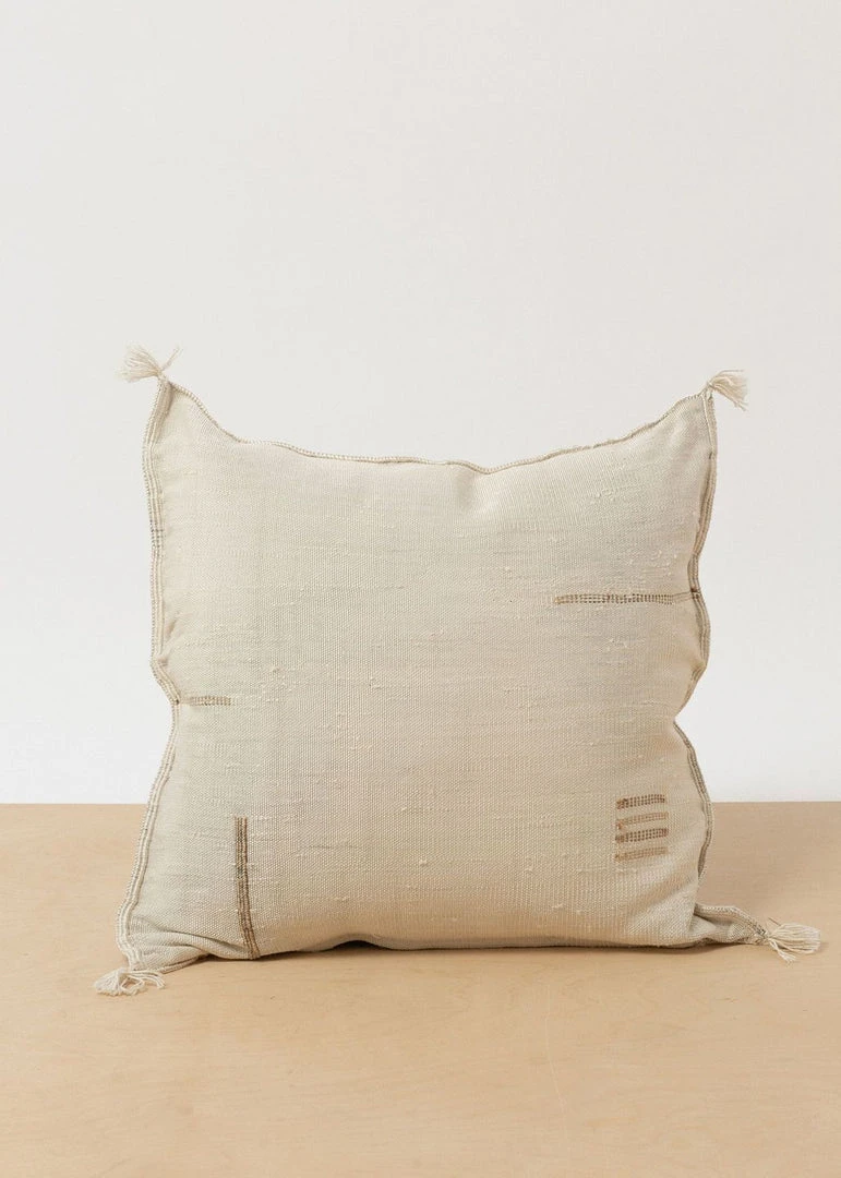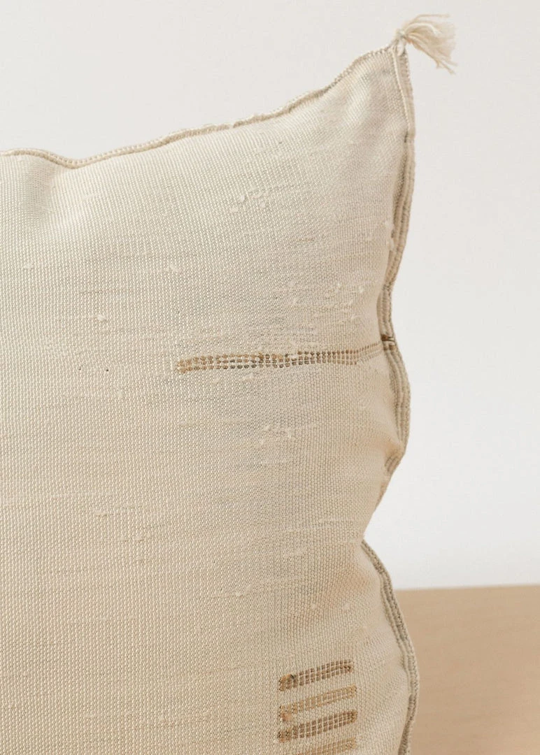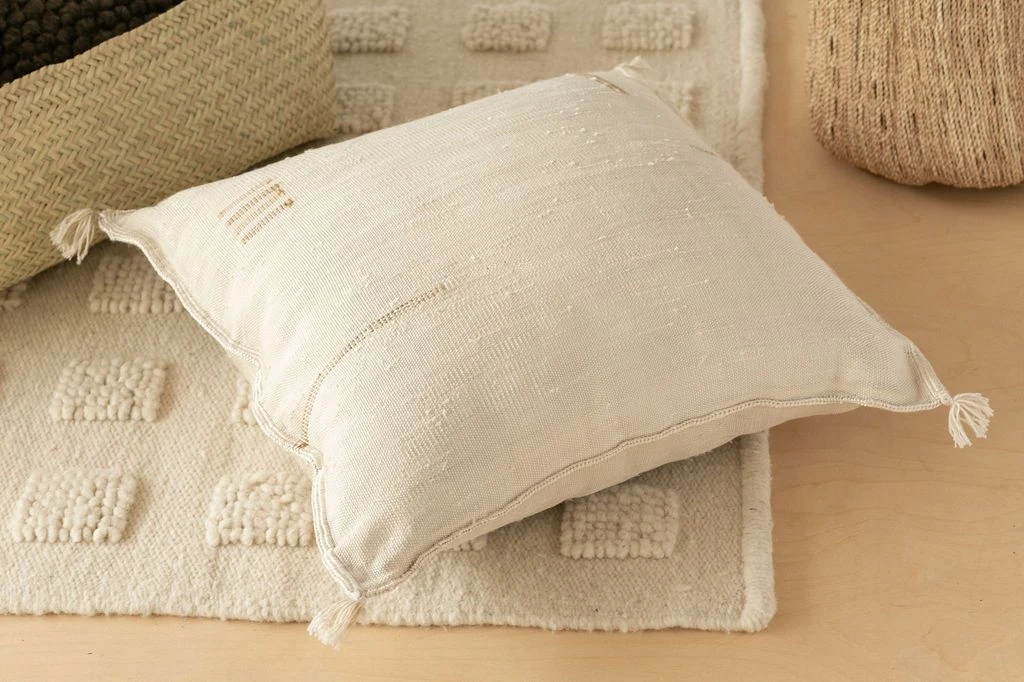 Grounded, earthy tones create lived in luxury for any space. A modern take on a Moroccan classic, these pillows are woven in small batches by a women’s collective in Boujad, Morocco. Weaving is a skill passed down through generations and part of Morocco’s cottage industry. Each piece takes many days to complete and is woven by hand on rudimentary vertical wood looms, often set up in women’s kitchens.