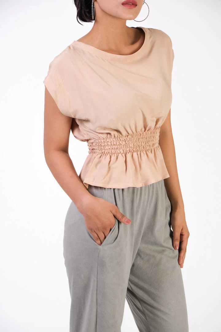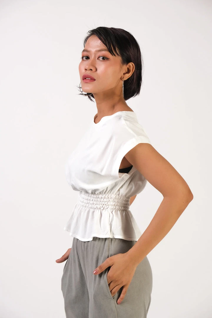 Offering femme summertime vibes with cinched waist and ruffled hem, this lightweight top is made using reclaimed rayon as part of tonlé’s sustainable zero waste process. Pair with your favorite bottoms and accessorize at will for easy breezy style.