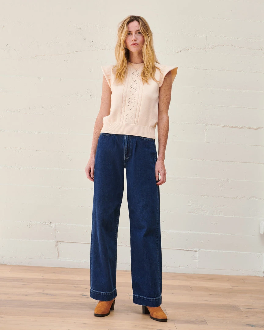 The Amelia Sweater boasts charming pointelle details at the bodice, a delicate flutter sleeve, and a clean finished ribbed neckline for a polished look. Knit from lightweight organic cotton and wool, this is a timeless spring sweater blouse.
