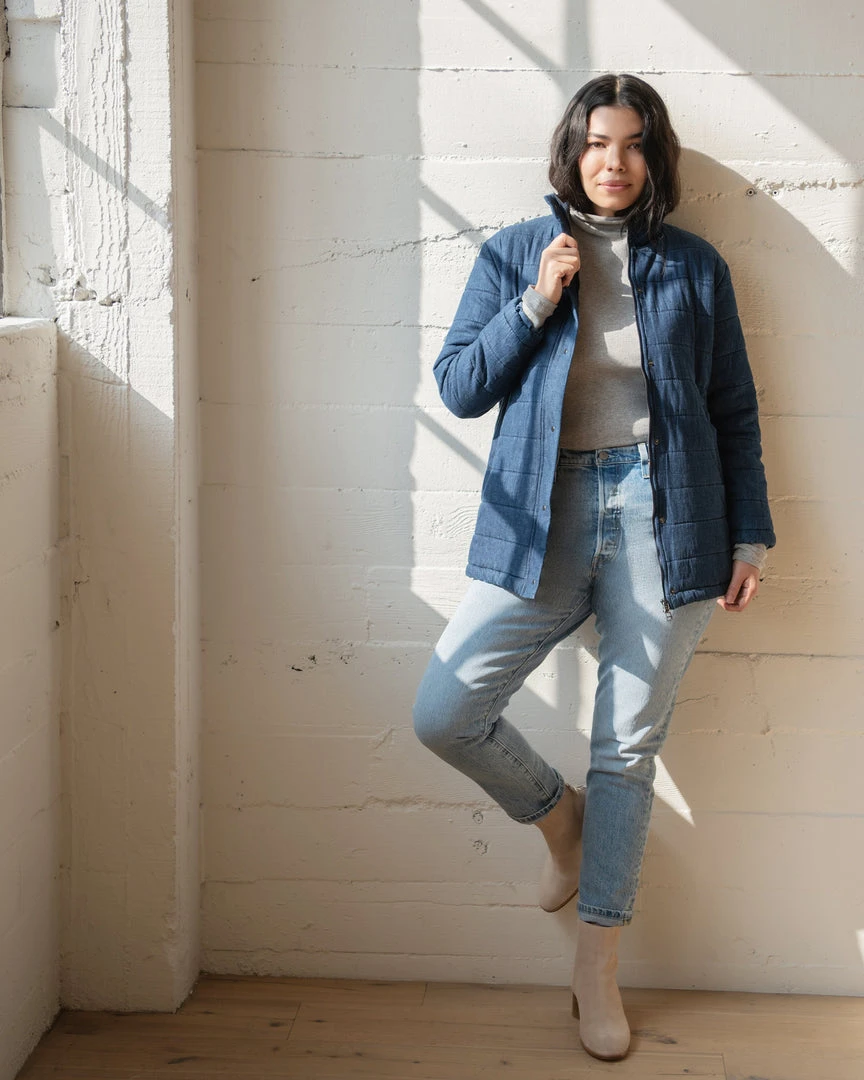 Every exceptional woman should wear an exceptional jacket, and this is just that piece. Always classic, the Cavallo Jacket is finished in a timeless medium wash with an elongated mandarin collar and subtle horizontal quilting.