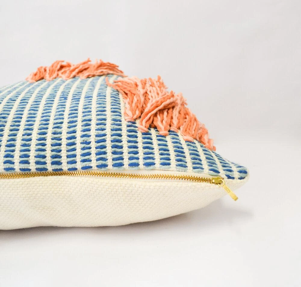 The Naidi, commonly known as açai, grows in the pacific tropical rainforest of Colombia. The Naidi Square pillow with Guayaba pink tassels is a strong, colorful and bold statement piece. Featuring indigo and soft sky blues together with sections of abundant orange and salmon colored tassels, this pillow is for the wild at heart, looking to bring life to any room.